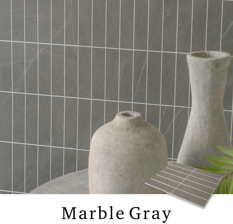 シックな空間をつくる、モダンで上品なマーブル柄。 マットな質感と相まって、空間全体を引き締めながらも、重すぎないバランスに。グレー地に対して目地が白く浮き出るため、グリッド感のあるシャープな印象が生まれます。
