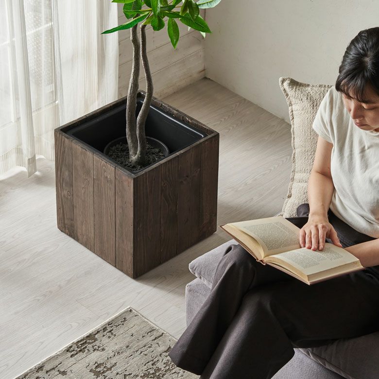 ・サスティナブル:リサイクルウッドで作られたプランターは、一点ものの風合いが魅力
