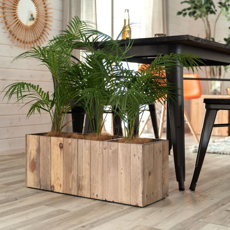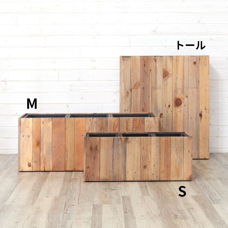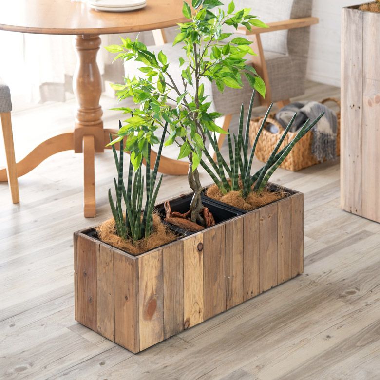 ・サスティナブル:リサイクルウッドで作られたプランターは、一点ものの風合いが魅力