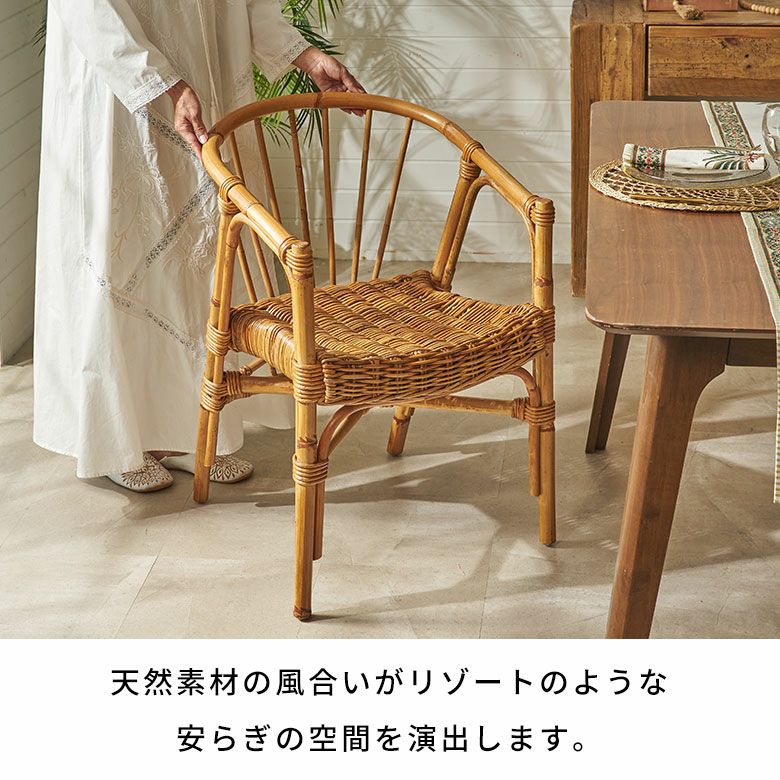 デザイン違いのラタンチェアーと組み合わせて使ってもおしゃれ。ラタンは使うほどに深みが増してくるのも魅力です。自分だけの特別なチェアーとして経年変化もたのしんで。