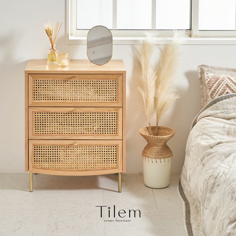 組立品 60cm幅 ローチェスト 収納棚 箪笥 リビング 寝室 ベッドルーム デザインチェスト 整理タンス 衣類 衣装 服 雑貨 小物 ワンルーム 模様替え コンパクト ギフト プレゼント チェスト 3段 タンス 収納 引き出し ラタン 籐 ウッド 木製 約 W 60cm D 38cm H 75cm ナチュラル 衣装ケース 収納ボックス 収納チェスト リビングチェスト キャビネット 脚付き タンス 衣類収納 おしゃれ 北欧 リゾート 家具 インテリア Tilem ティレム アジアン [61734]