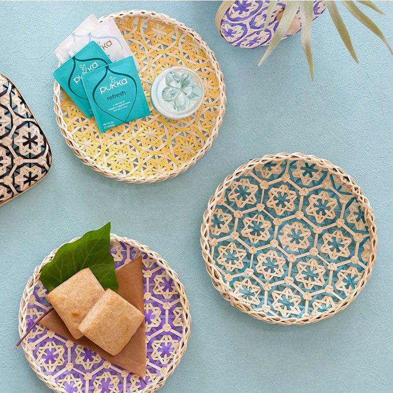 カラフルな竹ひごで均一に編まれた花柄模様が目を引くラウンドトレイ。