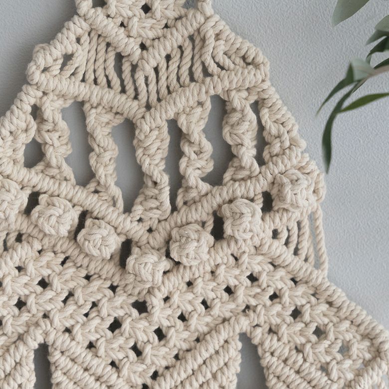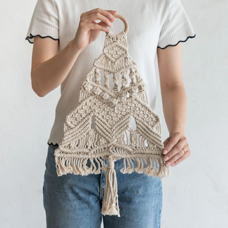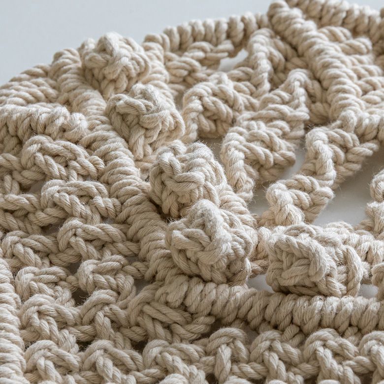 「マクラメ編み」とは、手で紐を結んだり編んだりという工程を繰り返し、模様を生み出す技法。