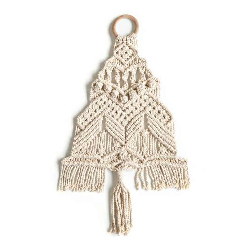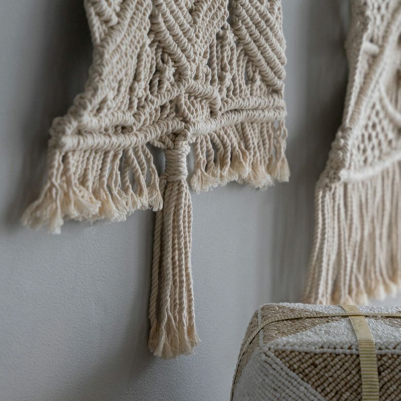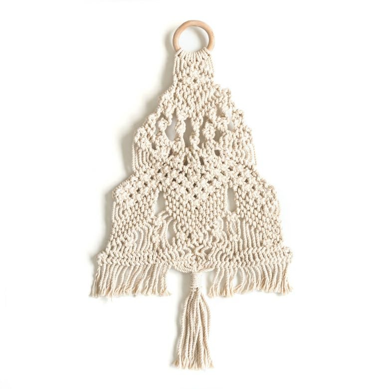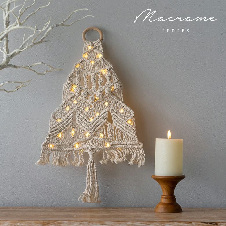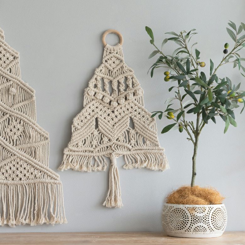 優しい色合いと、美しいマクラメ編みが特徴的なツリー型タペストリー。