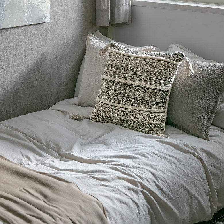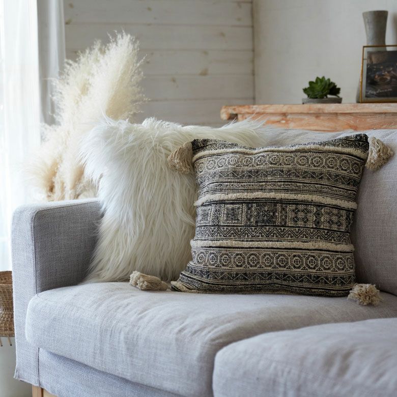 シンプルなデザインのクッションと合わせて、デコラティブピローとしても◎