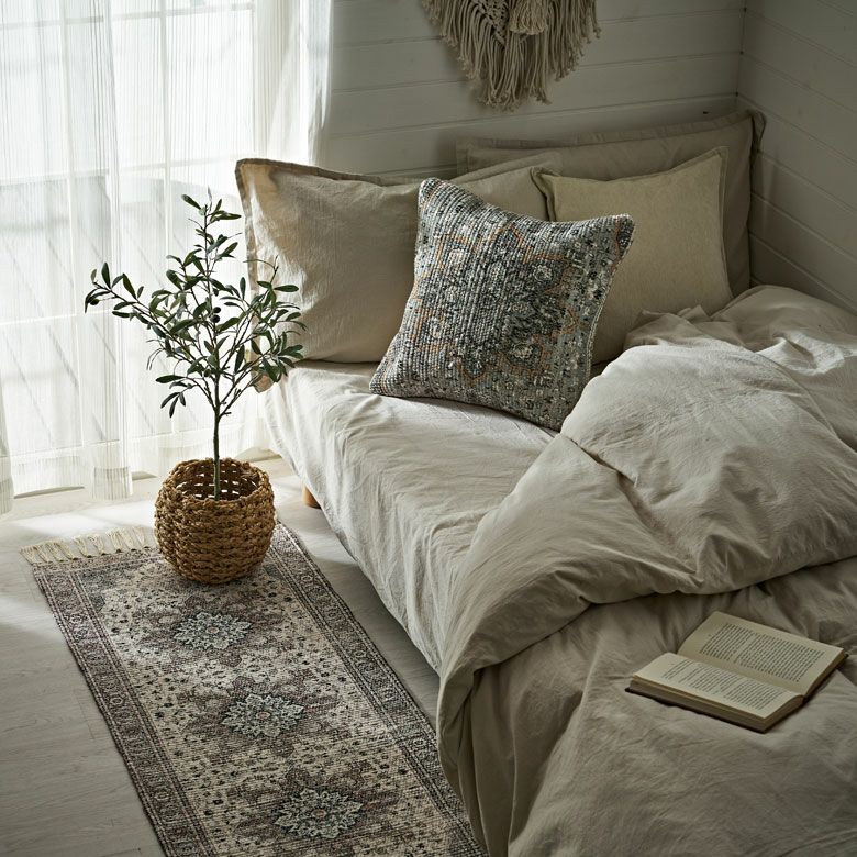 シンプルなデザインのクッションと合わせて、デコラティブピローとしても◎
