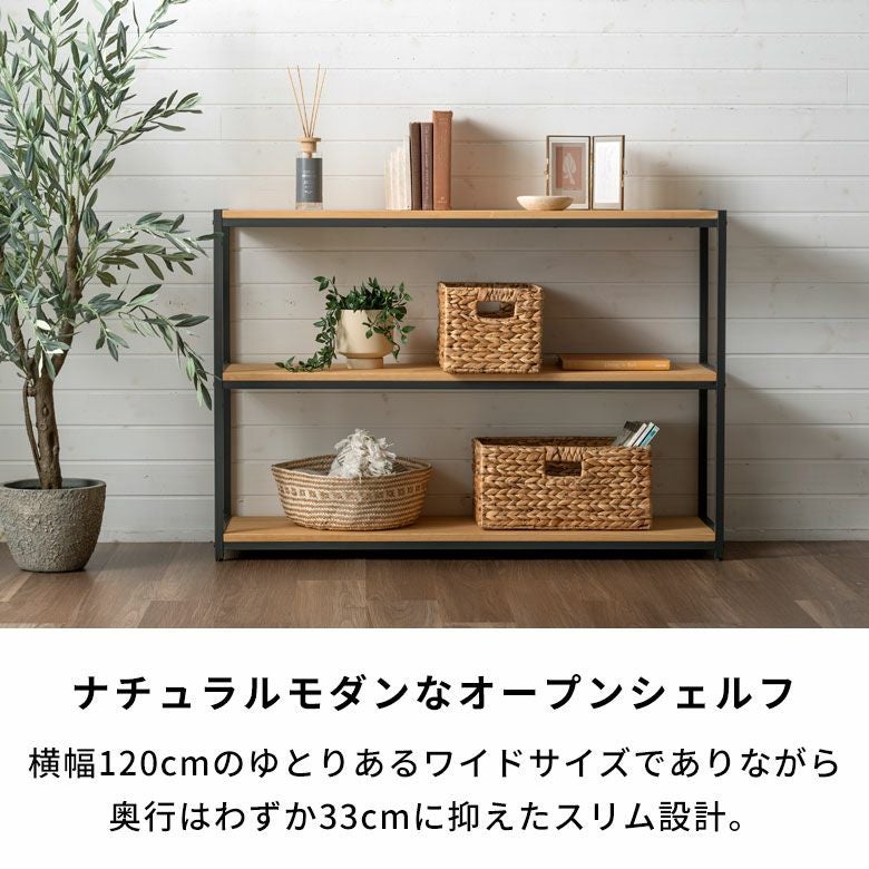HUSグランデシリーズのオープンラックは、横幅120cmのゆとりあるワイドサイズでありながら、奥行はわずか33cmに抑えたスリム設計。