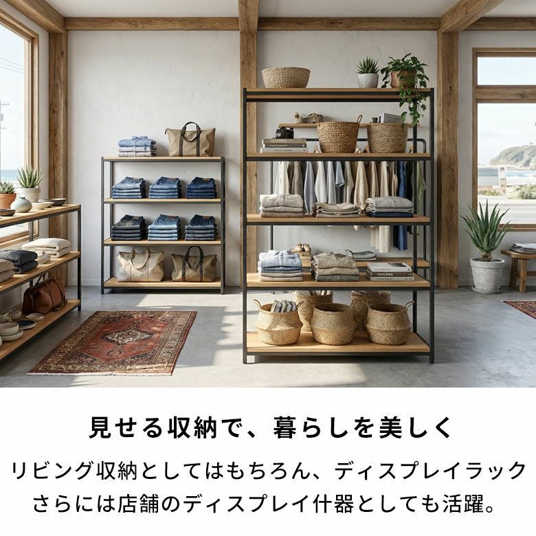 リビング収納としてはもちろん、ワークスペースの書類棚やディスプレイラック、土間ガレージの趣味収納、さらには店舗のディスプレイ什器としても活躍。