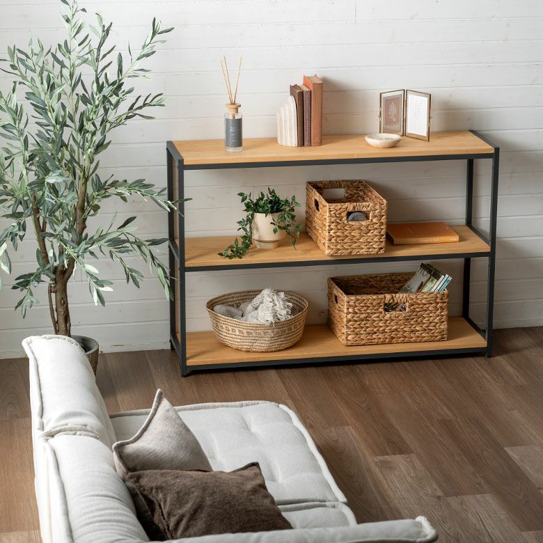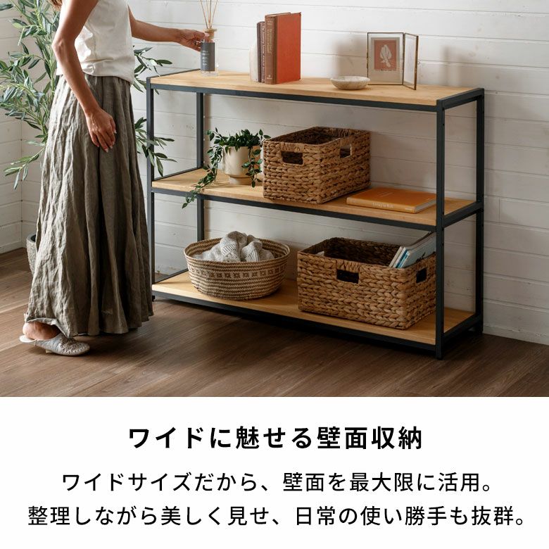 横幅120cmの広さを活かし、多様なシーンで「見せる収納」を実現します。