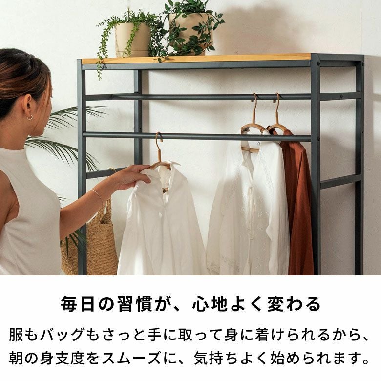 上部と下部にそれぞれ棚板がついており、服飾小物やバッグ、靴などファッションアイテムをまとめて管理できます。2本のバーで収納力もあり、服の仕分けにも便利。シリーズ使いで収納を広げ、クローゼットをおしゃれにコーディネートできるのも魅力のひとつです。