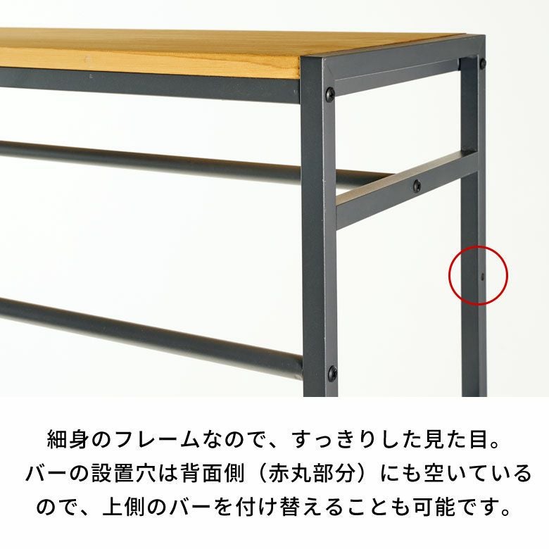 スチールバーの設置穴は背面側(赤丸部分)にも空いているので、上側のバーを付け替えることも可能です。