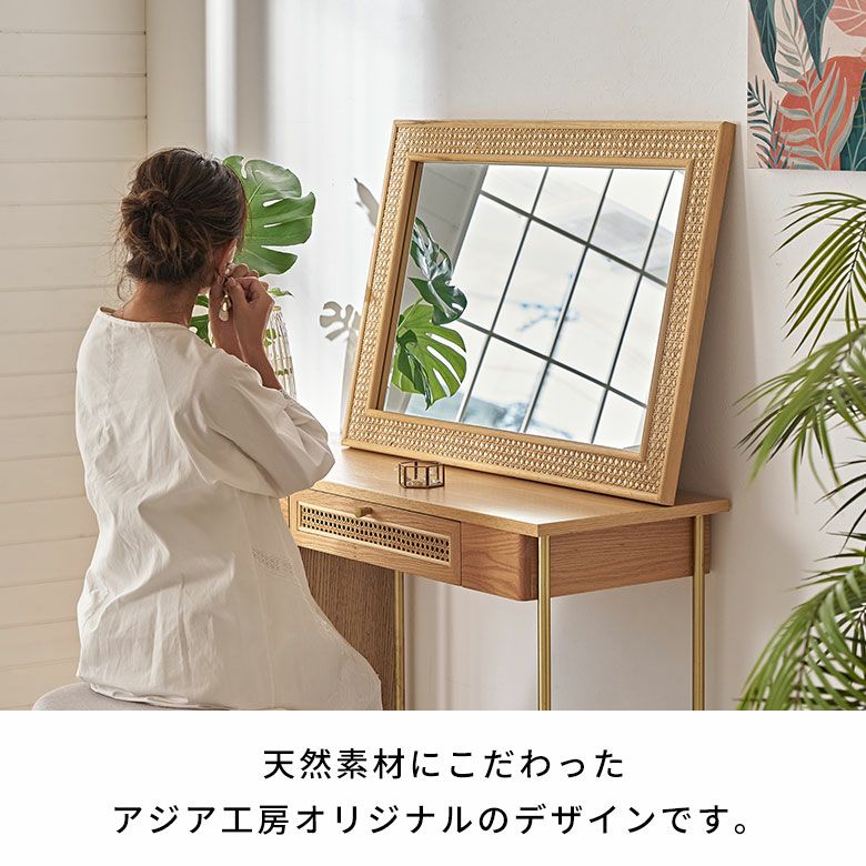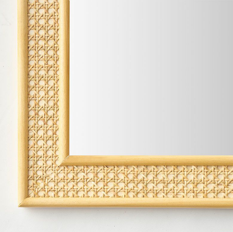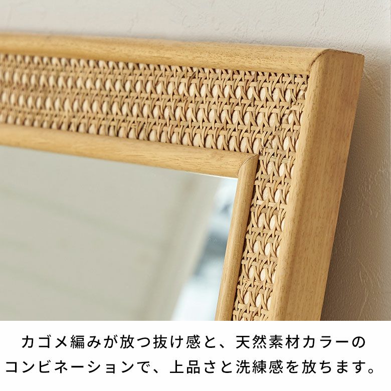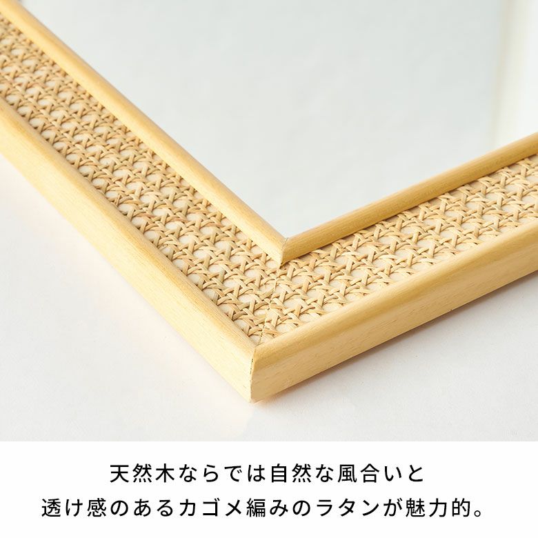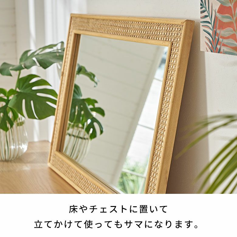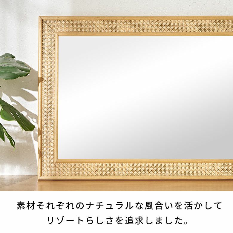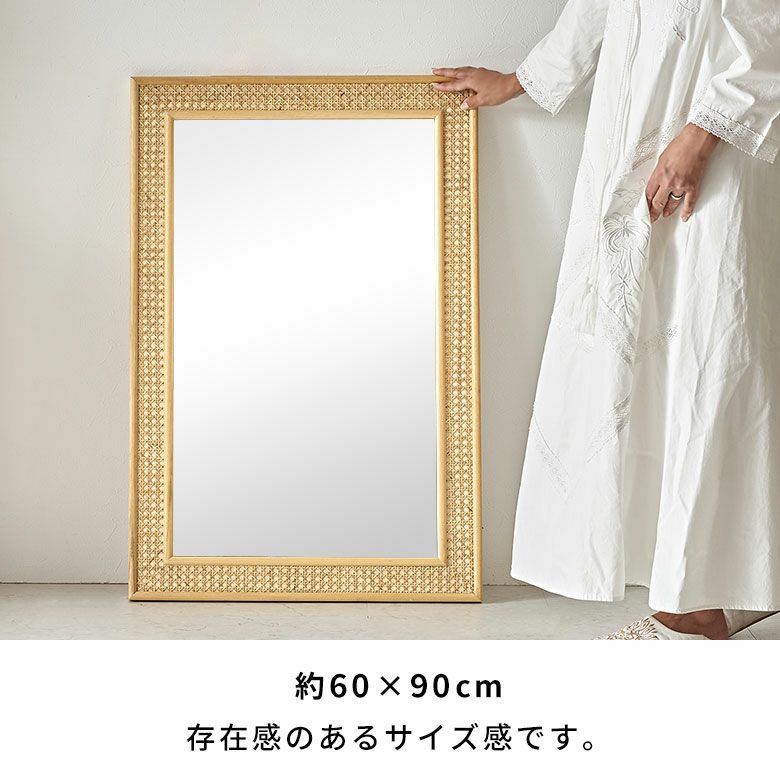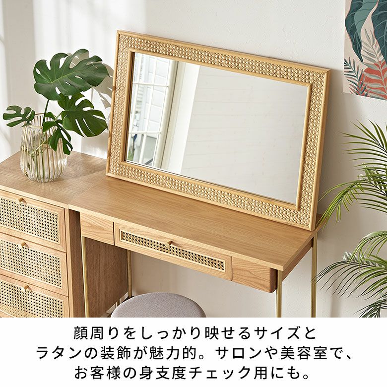 顔周りをしっかり映せるサイズとラタンの装飾が魅力的