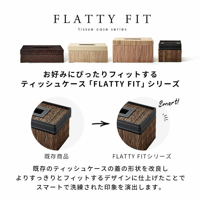 FLATTY FITシリーズは、4つのサイズ展開でお好みのサイズにぴったり合ったティッシュケースをお選びいただけるだけでなく、既存のティッシュケースの蓋の形状を改良し、よりすっきりとフィットするデザインに仕上げたことで、スマートで洗練された印象を演出します。