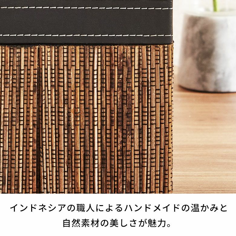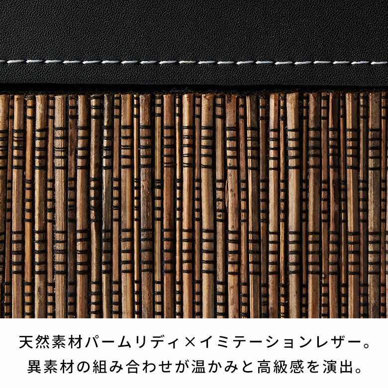 ちょっと聞きなれない素材の名前『パームリディ』とは、ヤシの葉っぱの芯を丁寧に糸で編んだもの。ヤシの葉の芯を乾燥させて細い棒状にし、黒い糸で編んで、すだれのように繋げています。インドネシアの熟練職人たちが丁寧に仕上げました。素朴さと、落ち着きのある上品な雰囲気が漂います。落ち着いた色合いなので、アジアンインテリアにはもちろん、モダンなお部屋や和室にも相性の良い天然素材です。