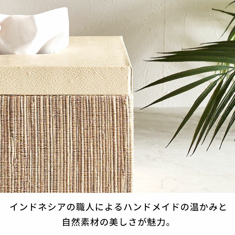 インドネシアの職人によるハンドメイドの温かみと自然素材の美しさが魅力の、ウォーターヒヤシンス素材×フェイクレザーのティッシュケース。