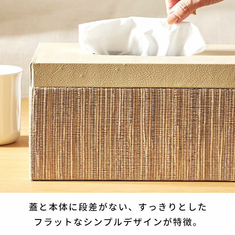 蓋と本体に段差がない、すっきりとしたフラットなシンプルデザインが特徴です。生活感が出がちなボックスティッシュを箱ごと入れるだけで、お部屋をよりスタイリッシュに演出。