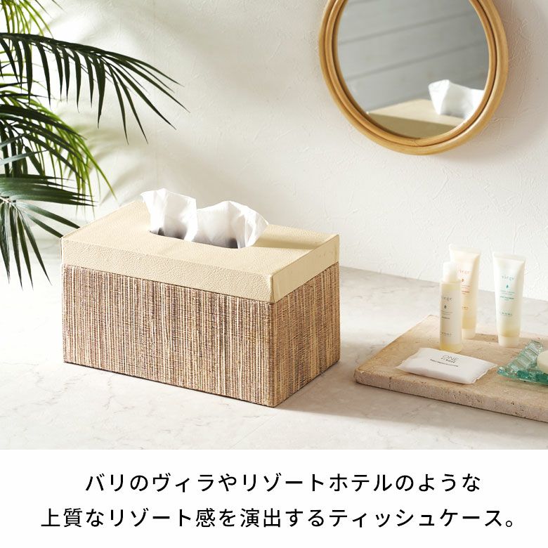 約幅27.5×奥行15.5×高さ15.5cmのエクストララージサイズは、厚型のプレミアムティッシュにぴったりなサイズ感。標準サイズのボックスティッシュを2つ収納することもできます。ナチュラルでありながら、バリのヴィラやリゾートホテルのような上質なリゾート感を演出するティッシュケースです。