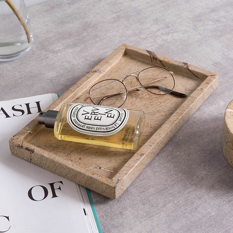 約W22.5×D15×H2cmの程よいゆとりのあるサイズで、スキンケア用品やメガネ、腕時計など複数の小物をすっきり整理しながら、空間に上質な存在感を添えます。