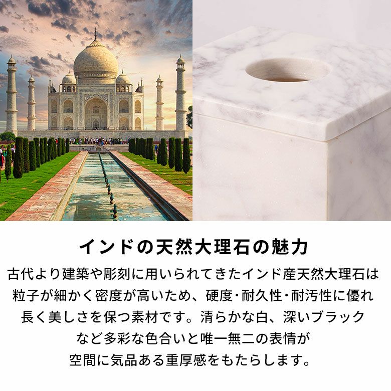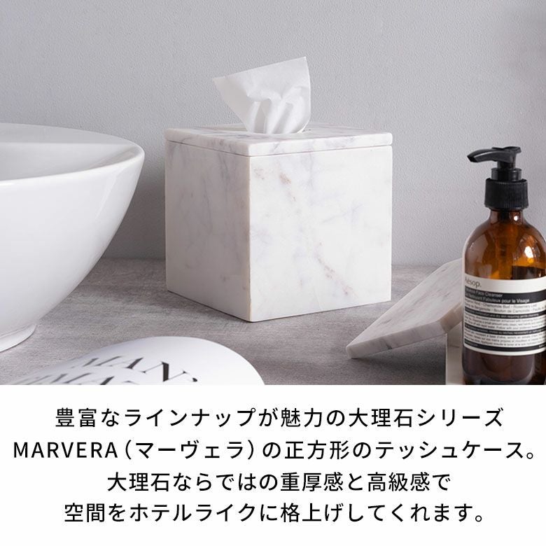 豊富なラインナップが魅力の大理石シリーズ、MARVERA(マーヴェラ)の正方形ティッシュケース。世界有数の大理石産地として知られるインドの天然大理石を贅沢に使用し、熟練職人がひとつひとつ丁寧に手作業で仕上げることで、素材本来の重厚感や温もり、そして自然が生み出す唯一無二の美しい表情を引き立てています。