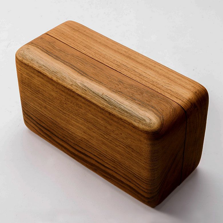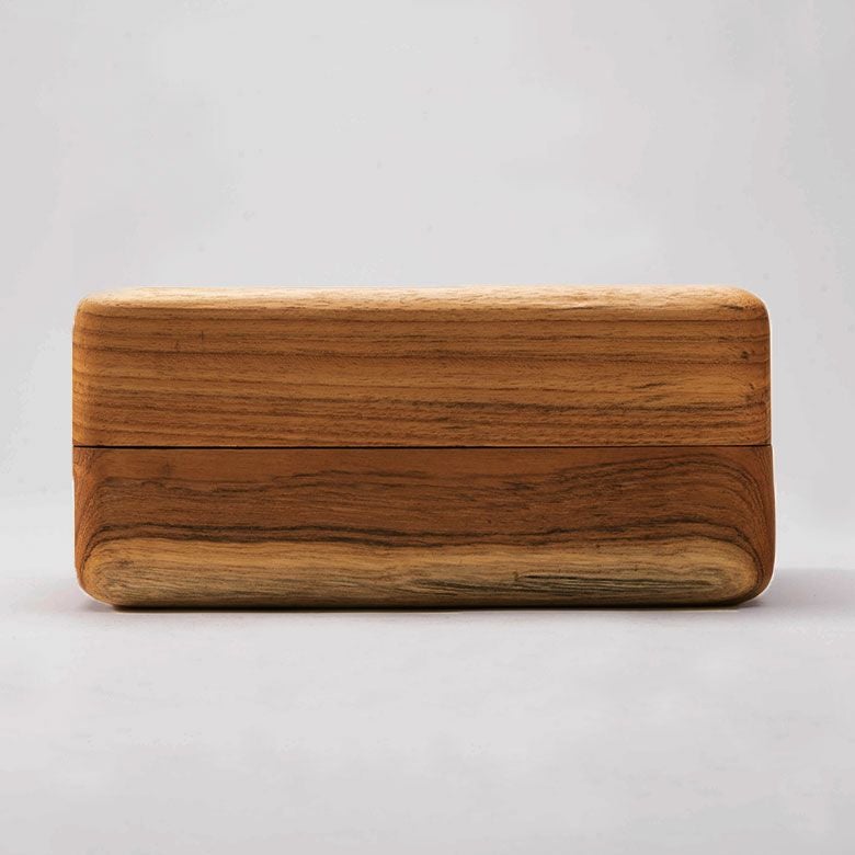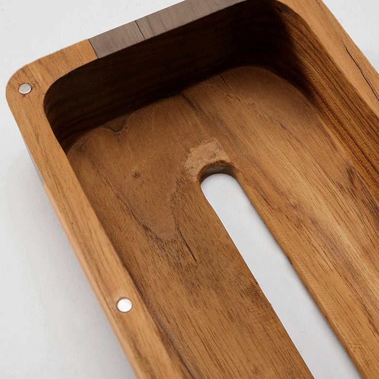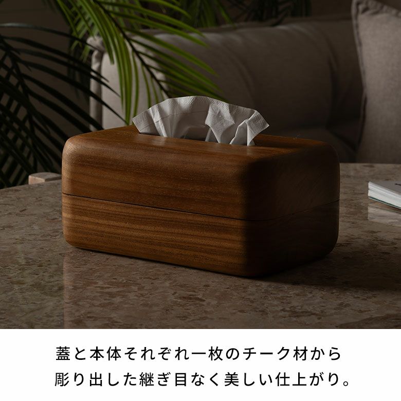 一枚板のチーク無垢材から彫り出した贅沢な逸品です。ラッカー塗装などの樹脂塗装に頼らず、オイルのみで仕上げているため、天然木そのものの手触りをお楽しみいただけます。使うほど色艶が深まり、年月と共に表情が変わるのも魅力。蓋はマグネット式で、ピタッと心地よく閉まります。上下が分離するので詰め替えもスムーズで快適。内部サイズは20×10.5×8cmで、一般的なソフトパックティッシュ2個分の収納力があるため、頻繁な詰め替えの手間から解放されます。