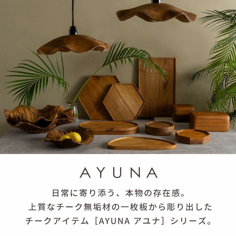 AYUNAはサンスクリット語に由来し、「生命」「歩み」を意味する言葉。穏やかな響きの中に、チークが持つあたたかさと生命力を映し出します。一枚ごとに異なる木目の表情が特別感を添え、使うほど艶をまといながら美しく育つ―― そんな経年変化も魅力。大切な方へのギフトにもふさわしい一品です。