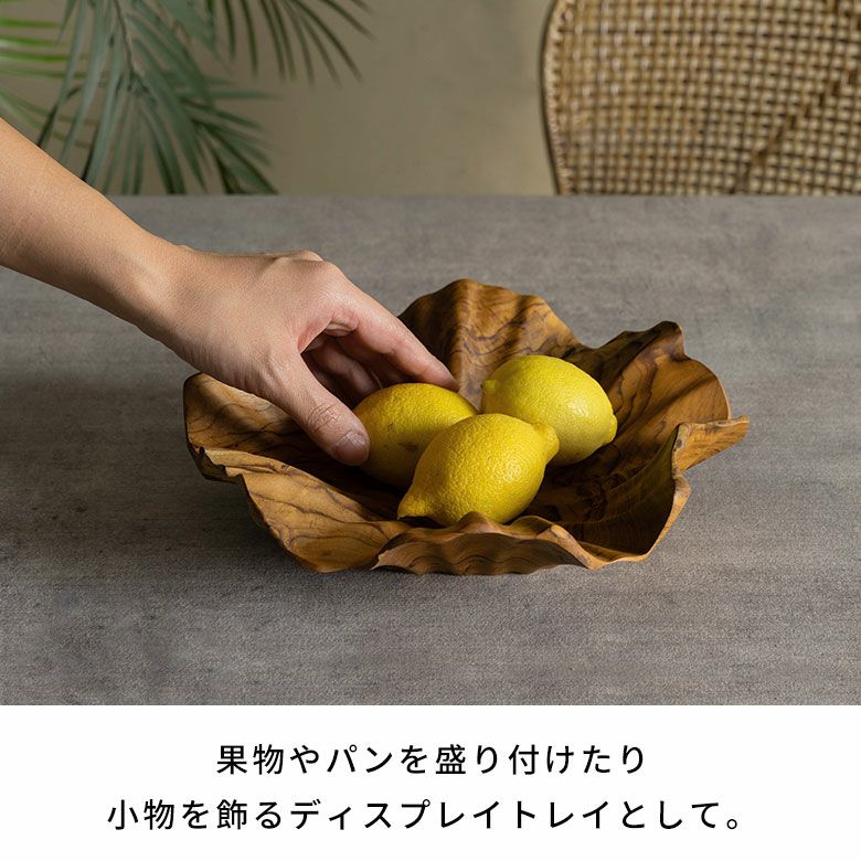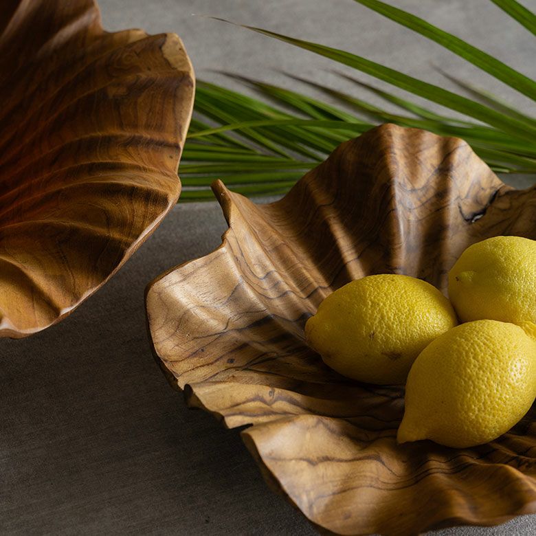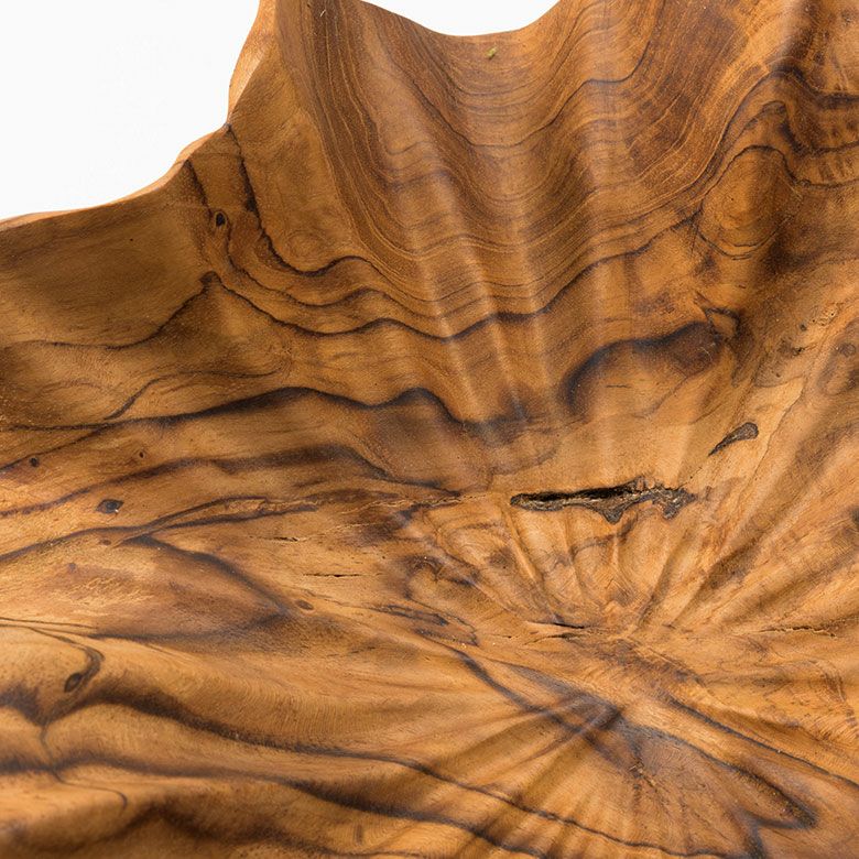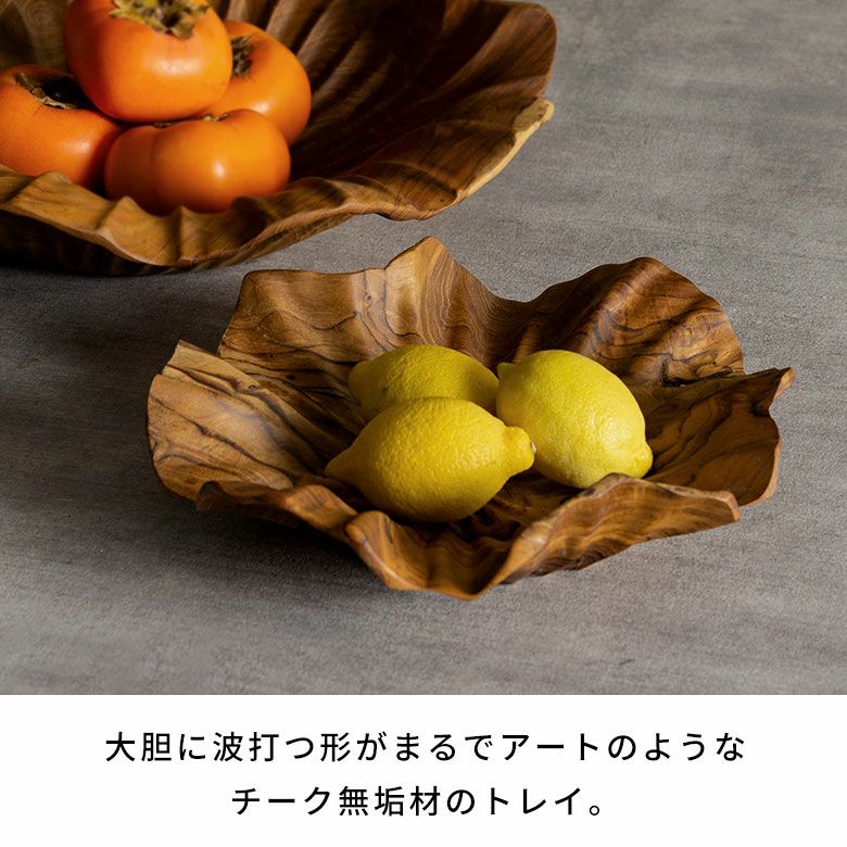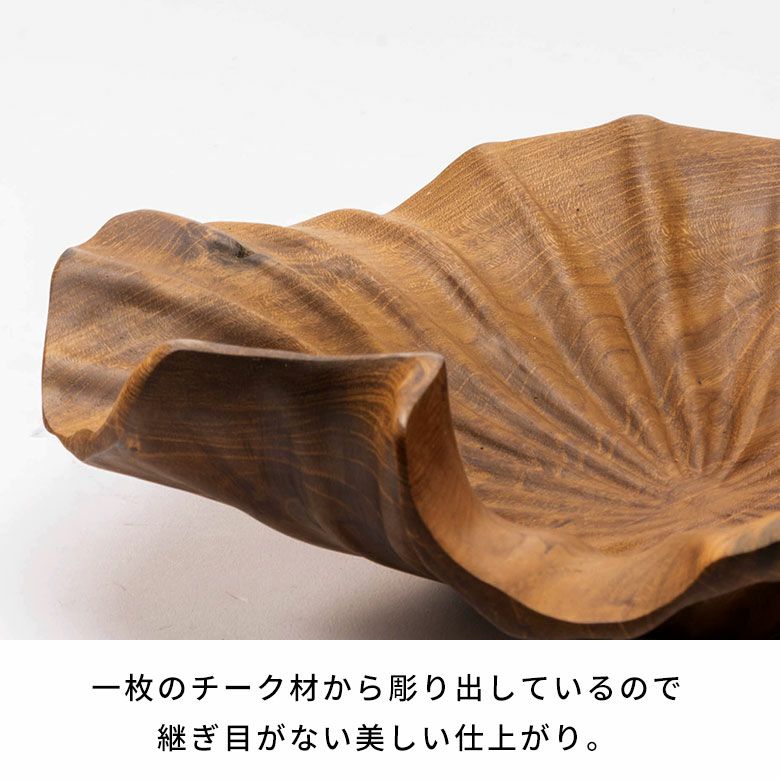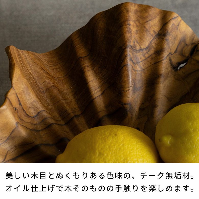 一枚板のチーク無垢材から彫り出した贅沢な逸品です。ラッカー塗装などの樹脂塗装に頼らず、食品用の安全基準を満たしたオイルのみで仕上げているため、天然木そのものの手触りをお楽しみいただけます。使うほど色艶が深まり、年月と共に表情が変わるのも魅力。日常使いしやすい約25×25cmサイズで、果物やパンを盛り付けたり、小物を飾るディスプレイトレイとして活躍します。