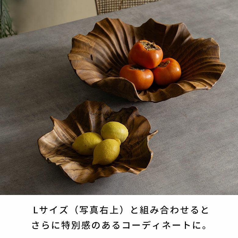 フルーツを盛り付ければ、まるでテーブルを飾るアート作品のよう。素朴な食材も絵になる一皿です。同じデザインのLサイズ(写真右上)と組み合わせると、統一感が生まれ、さらに特別感のあるコーディネートに。