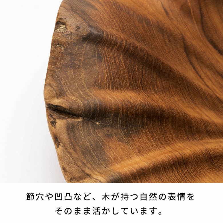 天然木の個性をそのまま活かした品のため、形・色・木目・節穴などにおいて、すべてが一点ものです。一枚ごとに異なる表情は、自然が生んだ個性。お届けする形はお任せとなりますが、それも「自然が選んだ出会い」として自分だけの特別な一点をお楽しみください。