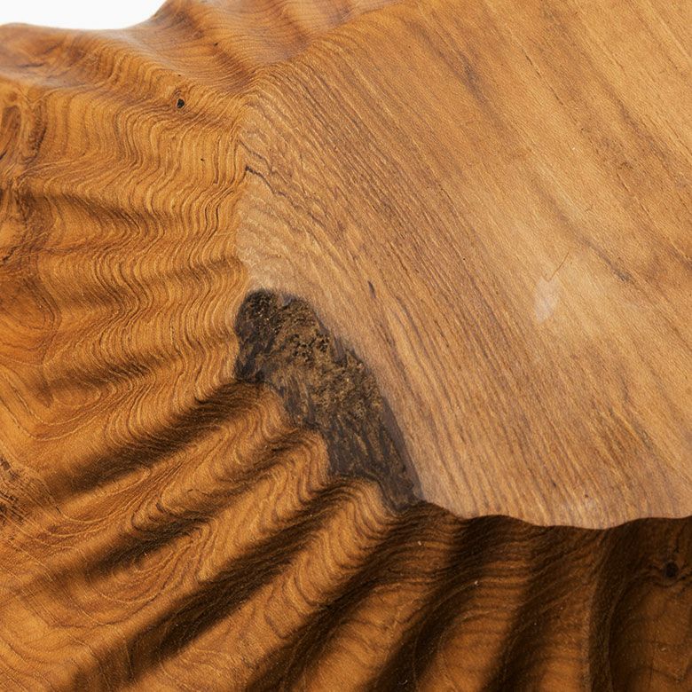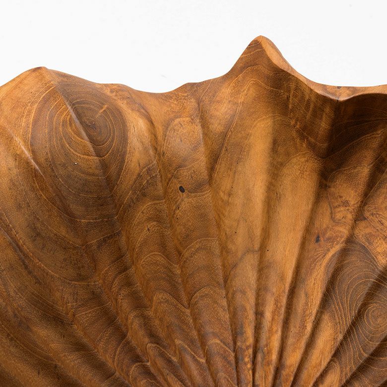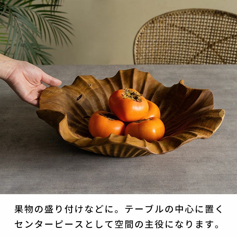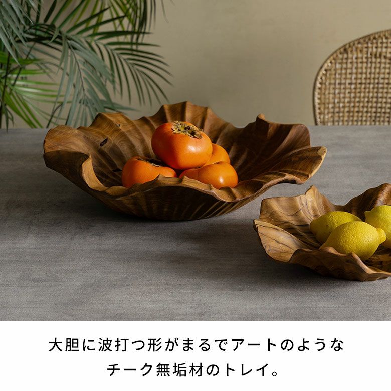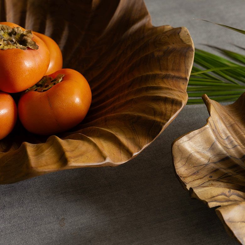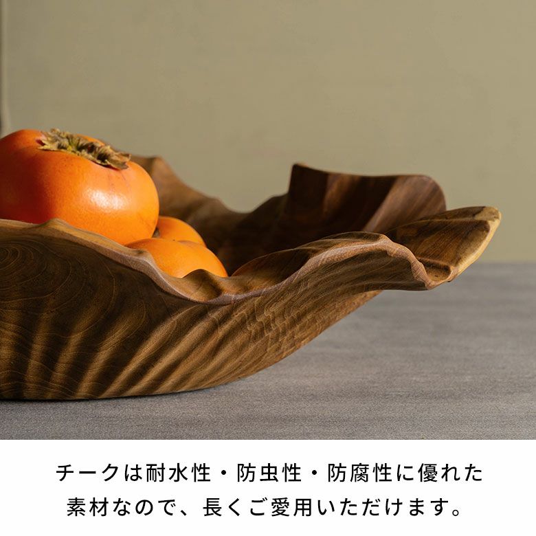 一枚板のチーク無垢材から彫り出した贅沢な逸品です。ラッカー塗装などの樹脂塗装に頼らず、食品用の安全基準を満たしたオイルのみで仕上げているため、天然木そのものの手触りをお楽しみいただけます。使うほど色艶が深まり、年月と共に表情が変わるのも魅力。存在感のある約40×40cmサイズで、果物やパンを盛り付けるトレイとしてや、テーブルの中心に置くセンターピースとして空間の主役になります。