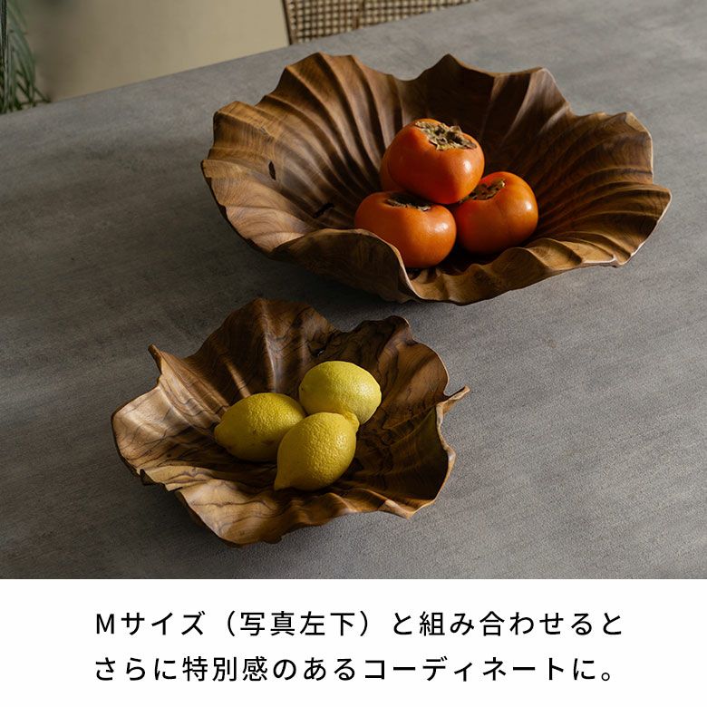 フルーツを盛り付ければ、まるでテーブルを飾るアート作品のよう。素朴な食材も絵になる一皿です。同じデザインのMサイズ(写真左下)と組み合わせると、統一感が生まれ、さらに特別感のあるコーディネートに。