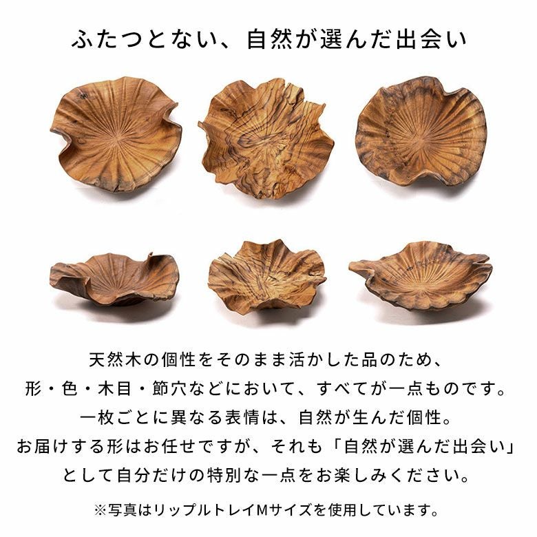 天然木の個性をそのまま活かした品のため、形・色・木目・節穴などにおいて、すべてが一点ものです。一枚ごとに異なる表情は、自然が生んだ個性。お届けする形はお任せとなりますが、それも「自然が選んだ出会い」として自分だけの特別な一点をお楽しみください。