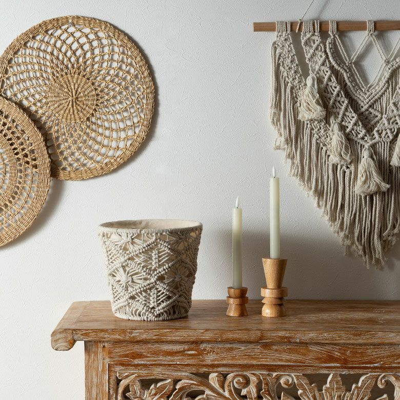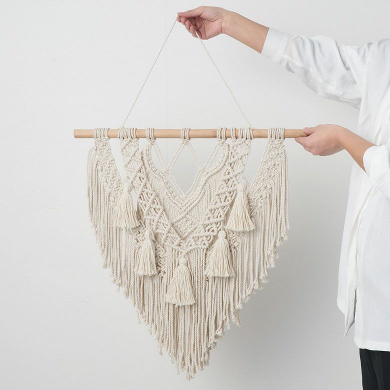 吊下げ オブジェ リビング ダイニング 寝室 玄関 ウォール デコレーション ディスプレイ パーティー ボヘミアン オールシーズン 装飾 模様替え ギフト プレゼント タペストリー マクラメ編み マクラメロープ ウォールデコレーション 約 W 55cm D 58cm H 4cm インド コットン ウッド 木 手作業 ハンドメイド 壁掛け 壁飾り アート インテリア おしゃれ 北欧 雑貨 リゾート エスニック BOHO ナチュラル ビーチ アジアン [34598]