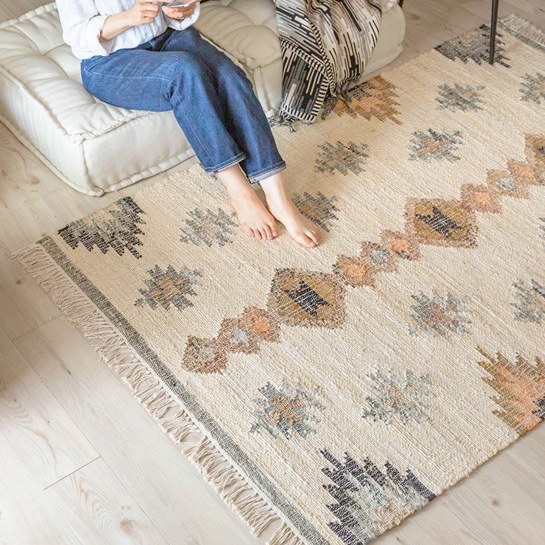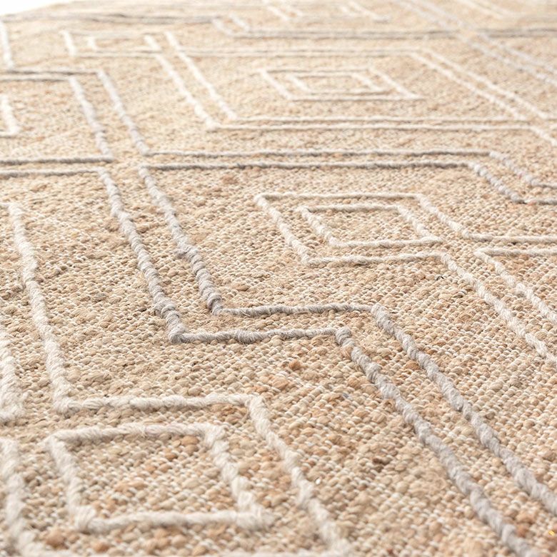 手織り リビング インド BOHO ボーホー 絨毯 敷物 マット ラグ ラグマット 約 130×190 cm 長方形 ジュート 麻 ウール 羊毛 ナチュラル [34446-nt]【 raha ラーハ デザイン カーペット 天然素材 ハンドメイド おしゃれ 北欧 オールシーズン 春 夏 秋 冬 リゾート ヴィンテージ風 幾何学模様 アジアン エスニック バリ 】