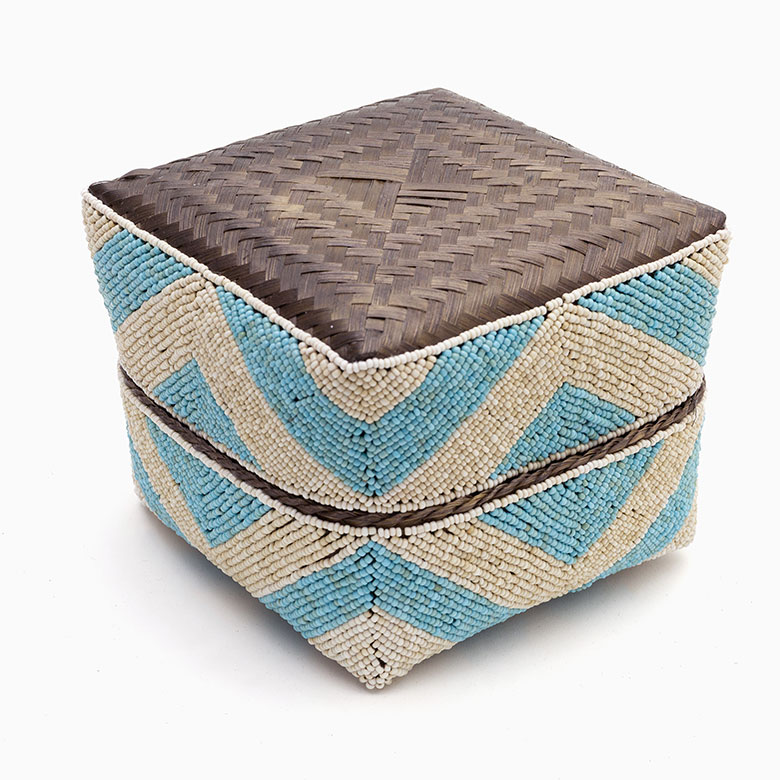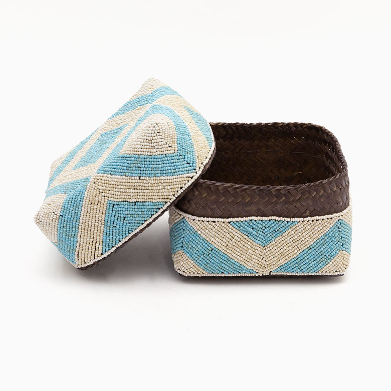 手作業で竹のスライスを編み、贅沢に底以外の全面をビーズで