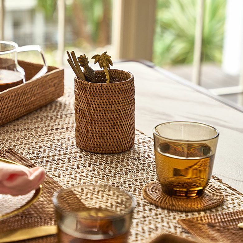 インドネシアに自生するアタを使い、熟練の職人がひとつひとつ丁寧に編み上げた天然素材100%の筒型ケース。細やかな手仕事の温もりが感じられます。