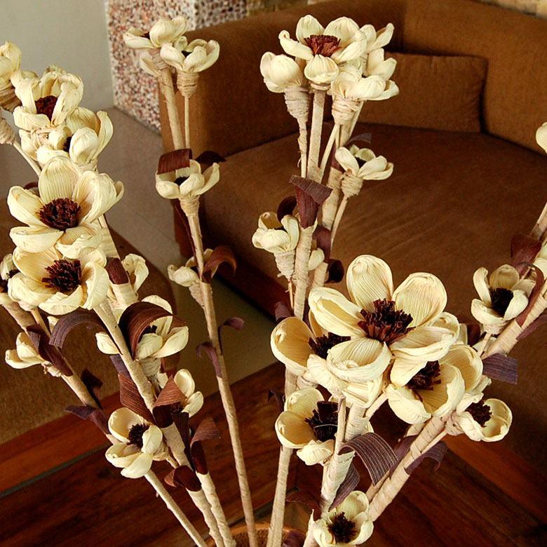 花びらはコーンリーフ、枝はバナナの木の皮で出来たアートプランツ。