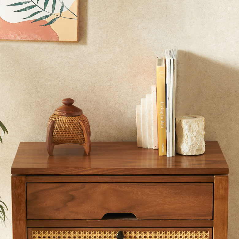 アクセサリーや小物を収納するケースとしてはもちろん、置いてあるだけでオブジェのような存在感を放ち、空間をしっとりとしたアジアンテイストに演出。ナチュラルであたたかみのある素材感が、日常のインテリアにやさしく溶け込みます。