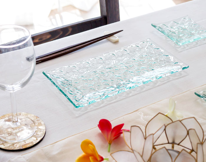 淡いブルーガラスに立体的な花びらがリゾート気分を盛り上げてくれるガラス皿。