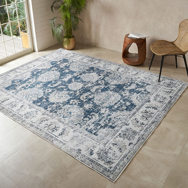 ヴィンテージラグの風合いを“手軽に・清潔に”楽しめる ペルシャ絨毯風ウォッシャブルラグマット!リビングをおしゃれに彩るオリエンタル柄 床暖房対応で年中快適 滑り止め付き 長年使いこんだようなかすれを再現したアンティーク風デザインのおしゃれなラグカーペット/約130x190cm 洗濯機で丸洗いOK 薄手で簡単お掃除&一年中使える 軽くて畳めてラクラク収納ラグマット [84400-e]
