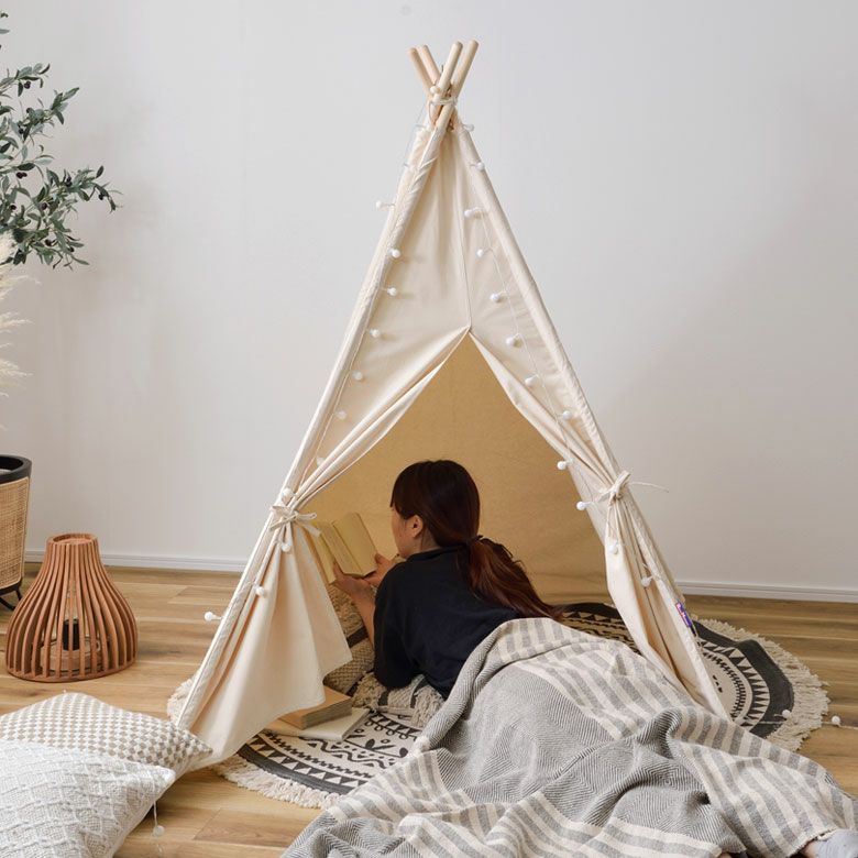 ティーピー ミニテント 簡単組立 キッズルーム ナチュラル ティピー テント 布 木 子供用 幅120cm 高さ150cm 室内用 [91545]【 キッズテント 円錐型 アイボリー ファブリック コットン ウッド 専用バッグ付き かわいい シンプル おしゃれ 子供 キッズ インディアンテント インテリア コンパクト収納 子供部屋 アジアン 】