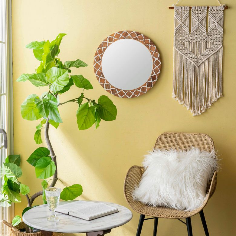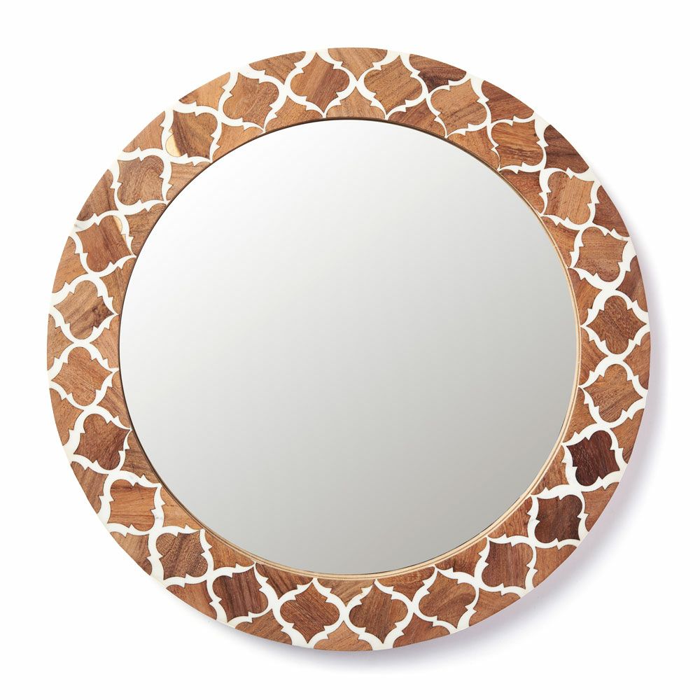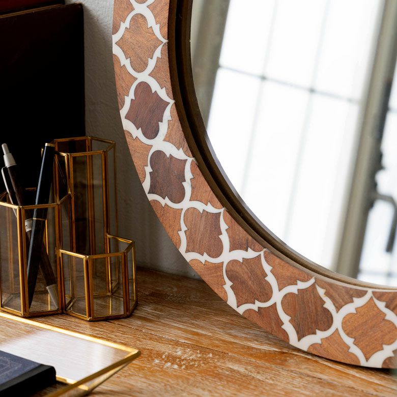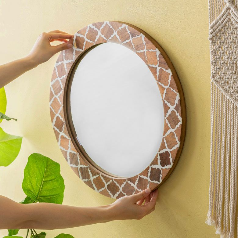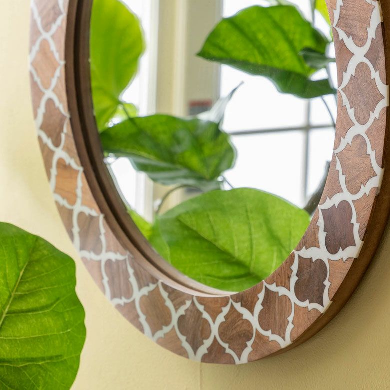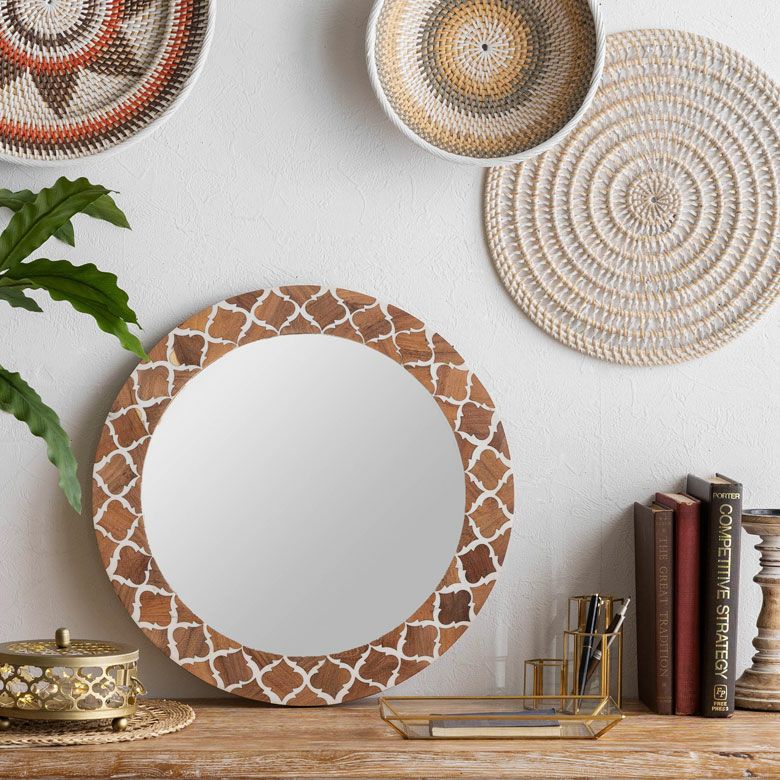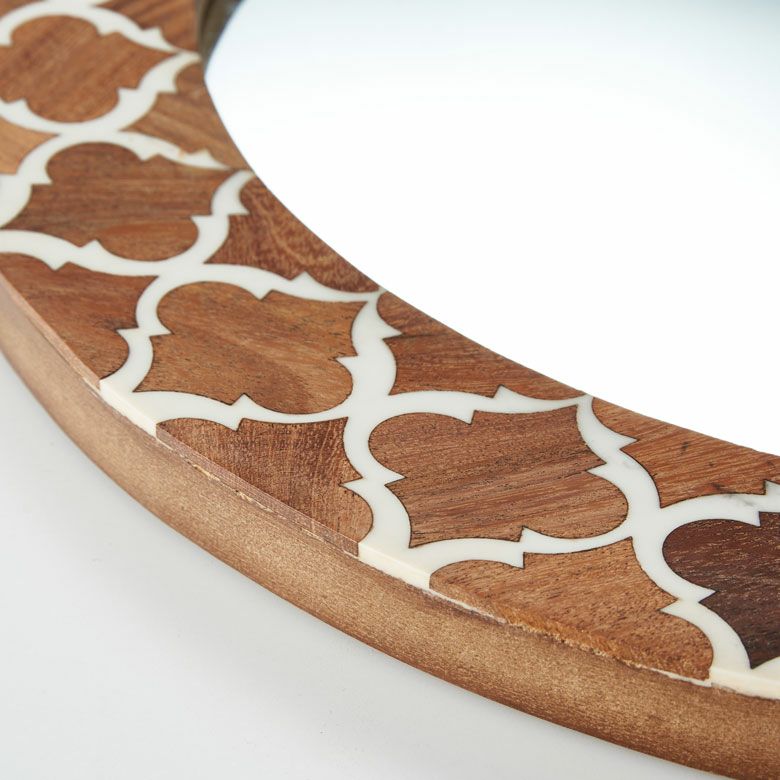 ラウンド インテリアミラー 壁にかける 丸い鏡 玄関鏡 新生活 鏡 壁掛けミラー 円形 丸型 ウッド×レジン モロッカン柄 約 W 45 × D 45 × H 2 cm 鏡直径 約35cm かがみ ウォールミラー 化粧鏡 壁かけ鏡 立て掛け鏡 ウォールデコレーション リビング 寝室 玄関 トイレ おしゃれ 北欧 モロッカン アジアン雑貨 モロッコ BOHO [34551]