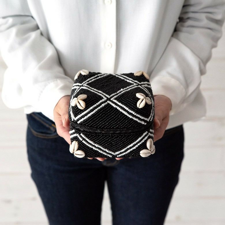 小物入れ 小物収納 アクセサリーケース ミニサイズ 小さ目 小箱 ソカシ ビーズ製 クロス柄 シェル付き 13×13cm ブラック [13533-s] 【 収納ケース 収納ボックス ギフトボックス 蓋付き 蓋付き収納 フタ付き ディスプレイ デコレーション ギフトボックス プレゼント おしゃれ 可愛い モノトーン アジアン雑貨 バリ島 バリ雑貨 リゾート 】