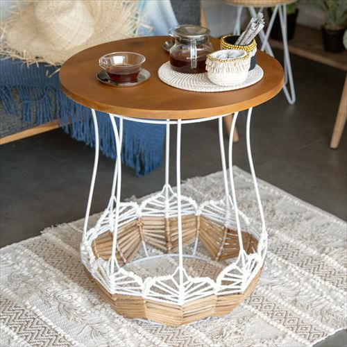 テーブル 木製サイドテーブル ディスプレイ 台 花台 ラウンド サイドテーブル 円型 木製天板 ロープ編み込みアイアン製脚 径55cm 高さ63cm ナチュラル×ホワイト [13716]【 リビングテーブル センターテーブル コーヒーテーブル 飾りテーブル ソファテーブル おしゃれ リビング アジアン家具 和モダン 北欧 モダン 】