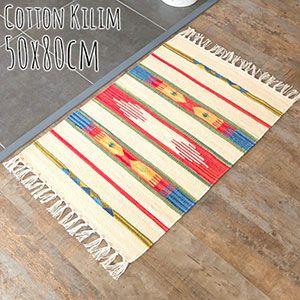 キリムラグ ラグマット インド綿 青 エスニックラグ ネイティブ コットン マット ワイドボーダー柄 フリンジ付き 綿100% 50×80cm ブルー [34400-bl]【 ラグ 玄関マット 室内 キリムラグ キリム風ラグ ストライプ柄 カーペット ラグマット おしゃれ 夏用 オールシーズン コットン 綿 インテリア アジアン 雑貨 アジアン雑貨 】