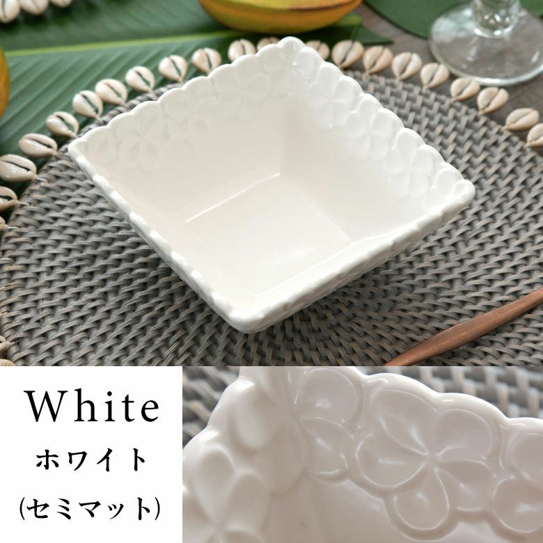 正角皿 器 サラダボウル 盛り皿 白食器 テーブルコーディネート 深角皿 プルメリアモチーフ Mサイズ 14.5cm角 ホワイト 陶器製 [pl7-66823 pl7-66824]【 食器 スクエアボウル 深皿 スクエアプレート 角皿 角深皿 マルチボウル シリアルボウル おしゃれ キッチン雑貨 アジアン 雑貨 アジアン雑貨 】