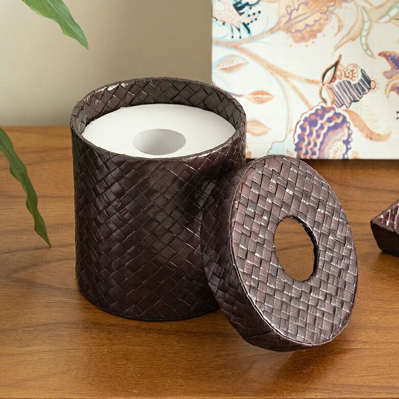 レザーのような編み目が特徴のパンダン製トイレットペーパー収納ケース。フタに穴が開いているので小さなごみ箱としても使えるバリ島の人気アジアン雑貨 パンダンで編まれた丸いトイレットペーパー収納ケース ブラウン色 カバー ティッシュケース ごみ箱 ゴミ箱 ダストボックス アジアン雑貨 フタ付き おしゃれ エスニック バリ雑貨 ホルダー ロールペーパーホルダー トイレットペーパーケース トイレットペーパー [8404]