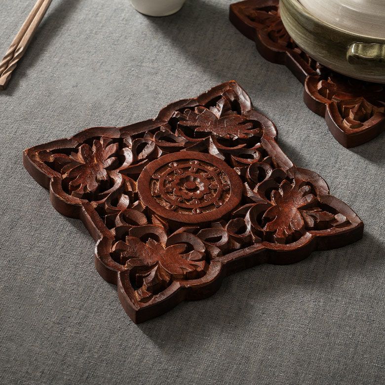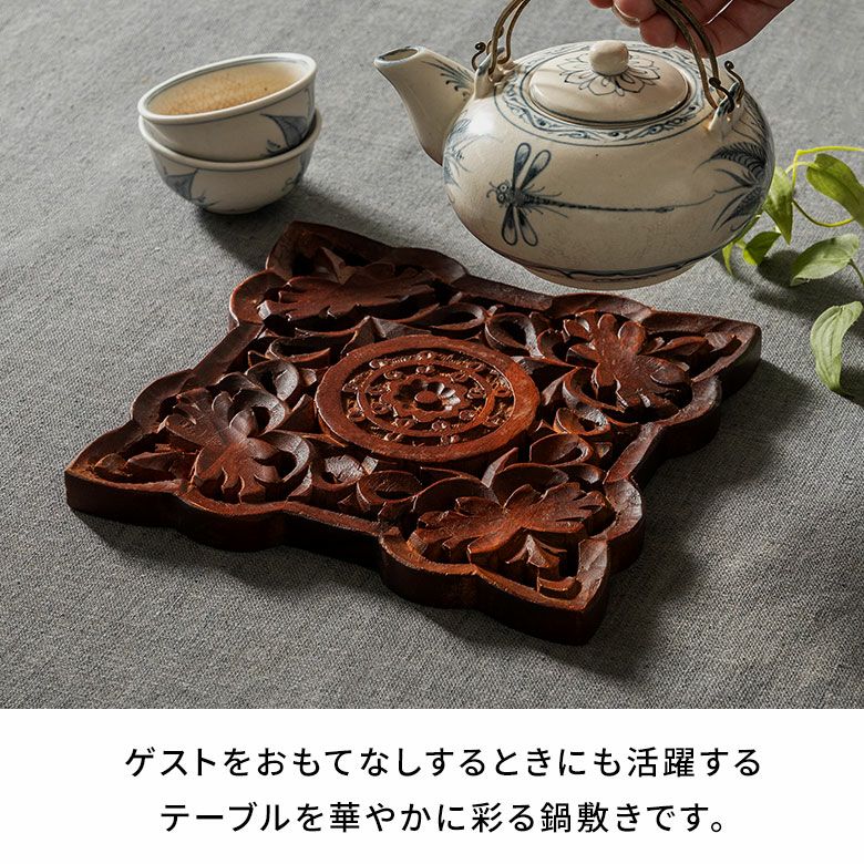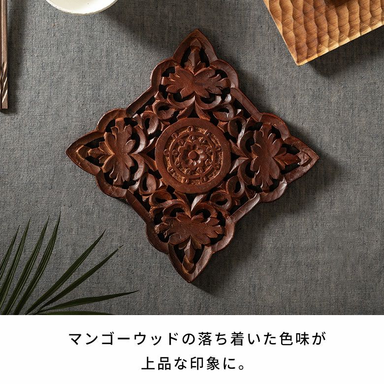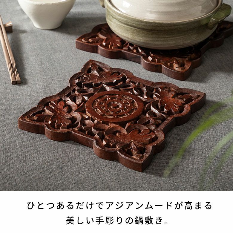 レリーフ デコレーション 什器 飾り 置き物 ハンドメイド なべしき 手彫り 職人技 やかん ケトル フライパン キッチンアイテム アートパネル オーナメント モダン ギフト プレゼント 鍋敷き 天然木 木製 マンゴーウッド 木 鍋しき スクエア 四角 約 W 21cm D 21cm H 2cm ブラウン ナチュラル キッチン雑貨 キッチン ダイニング 耐熱 食卓 鍋 グラタン 彫刻 オーブン 料理 リゾートインテリア おしゃれ 北欧 リゾート 雑貨 インテリア アジアン [34610]