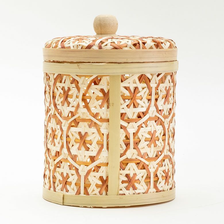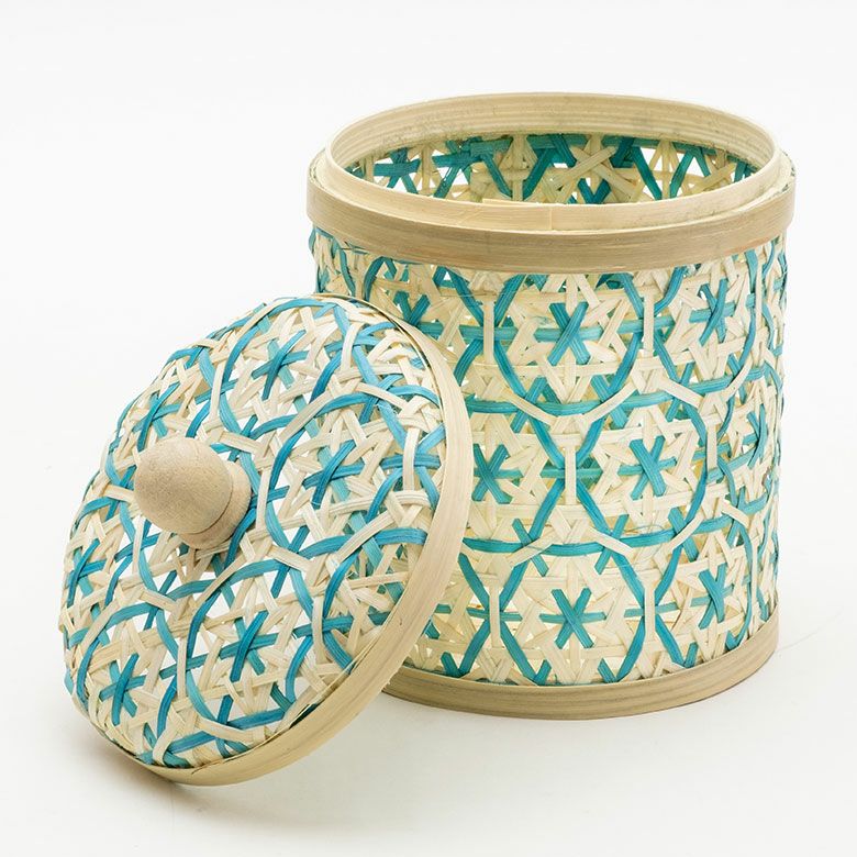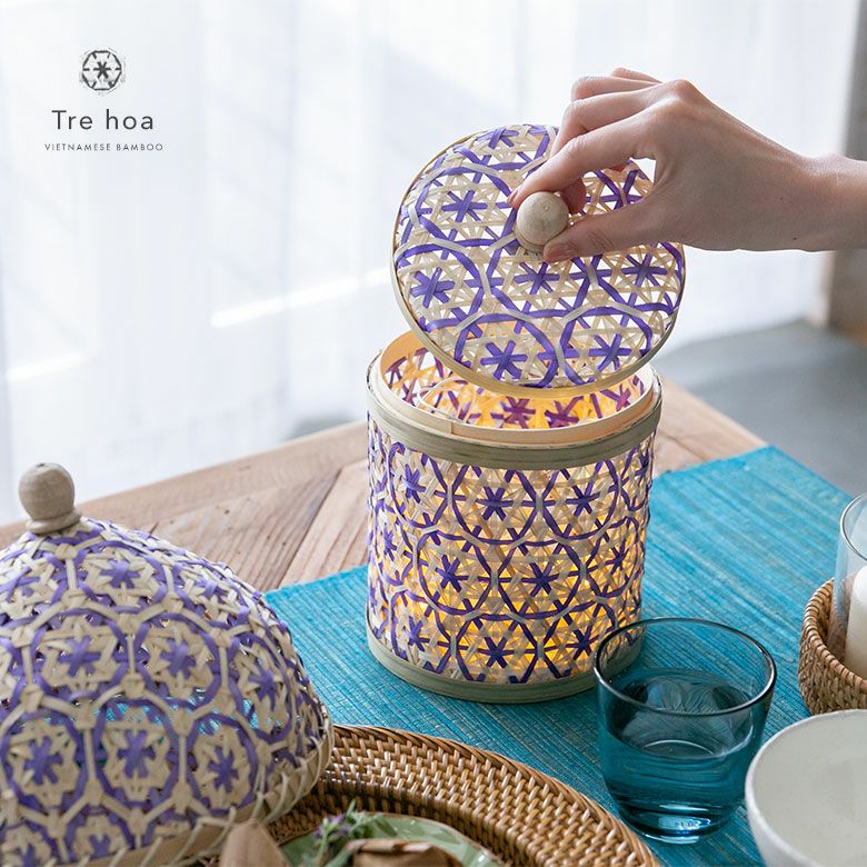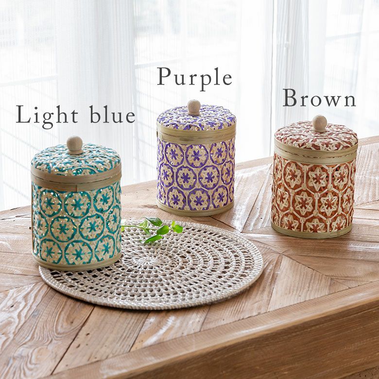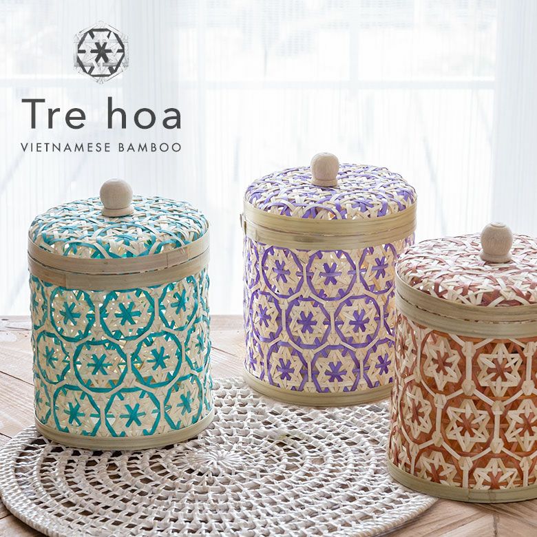 小物入れ 卓上 ダストボックス ゴミ箱 プランターカバー ケース バンブー 蓋つき キャニスター 直径 約 14cm ブラウン ブラック アイボリー ライトブルー パープル [51312]【 竹 収納 花柄 花編み 円 サークル 丸 トイレットペーパー レトロ おしゃれ カラフル ベトナム エスニック アジアン 雑貨 チェーホア Tre hoa 】