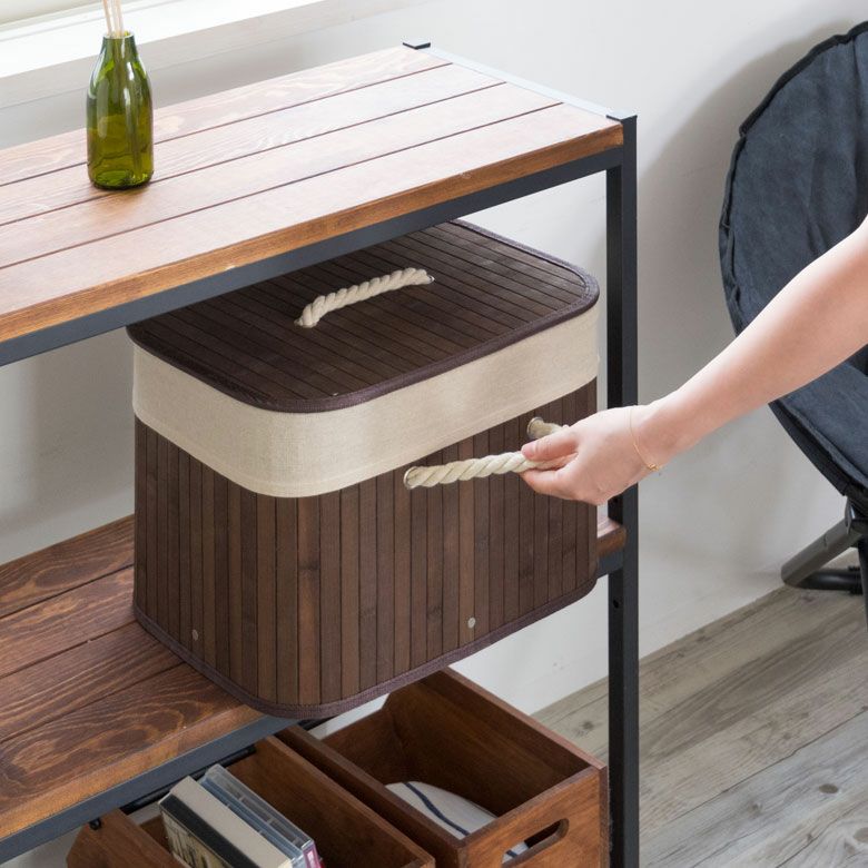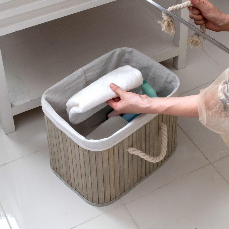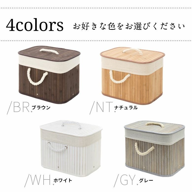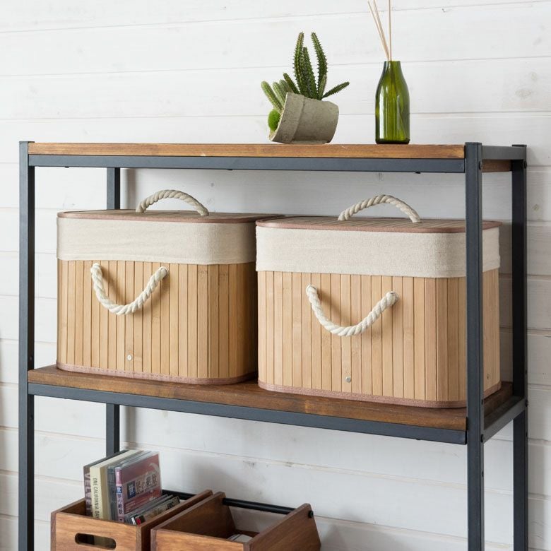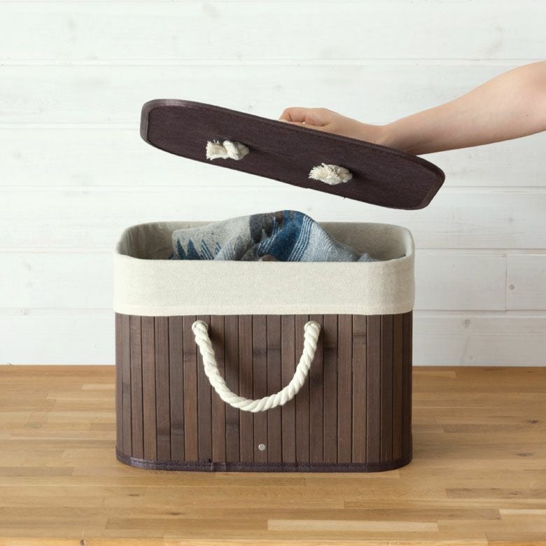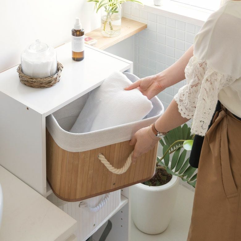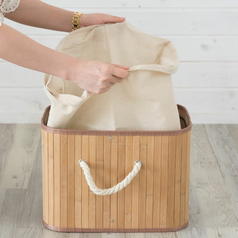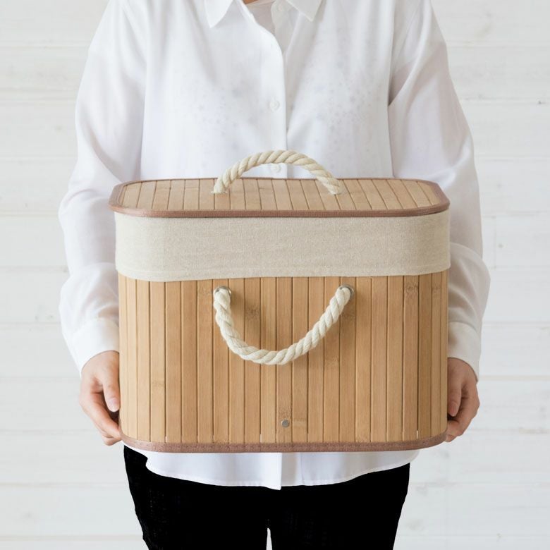 ロープハンドルのバンブーバスケット。カラーボックス対応。 ロープハンドルがおしゃれな スクエア型 バンブーバスケット ショートタイプ(66440-66441-66442)【収納ボックス ランドリーバスケット おしゃれ 収納かご カラーボックス バスケット 内布付き かわいい 片付け 目隠し ふた付き 蓋付き 竹 バンブー】