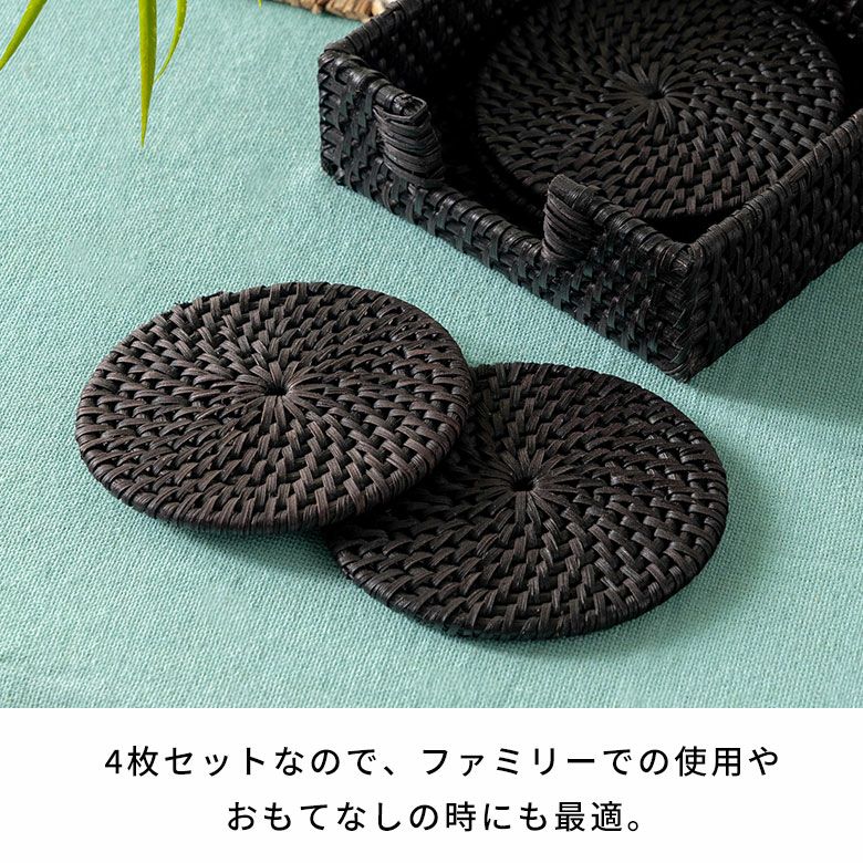 テーブル小物 テーブル装飾 パーティー クリスマス ハロウィン レストラン カフェ 店舗用 テーブルコーディネート テーブルセッティング テーブルコーデ 什器 撮影 ギフト プレゼント コースター ラタン 籐 ブラック ラウンド 円形 4枚セット 収納ケース 付き 約 W 13cm D 13cm H 4cm トレイ トレー デコレーショントレイ ディスプレイトレイ テーブルウエア ダイニング キッチン キッチン雑貨 おしゃれ 北欧 リゾート 雑貨 インテリア アジアン [14110]